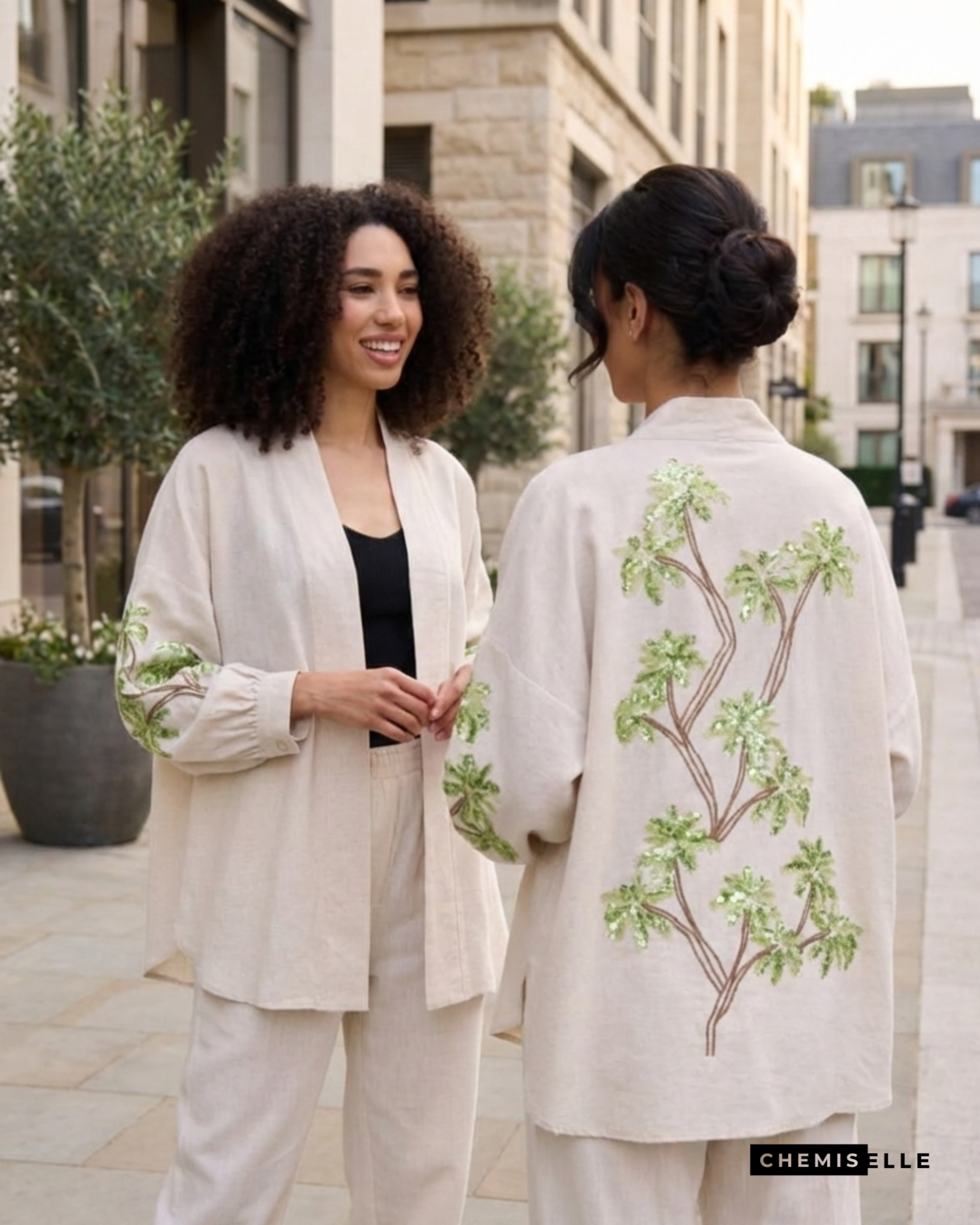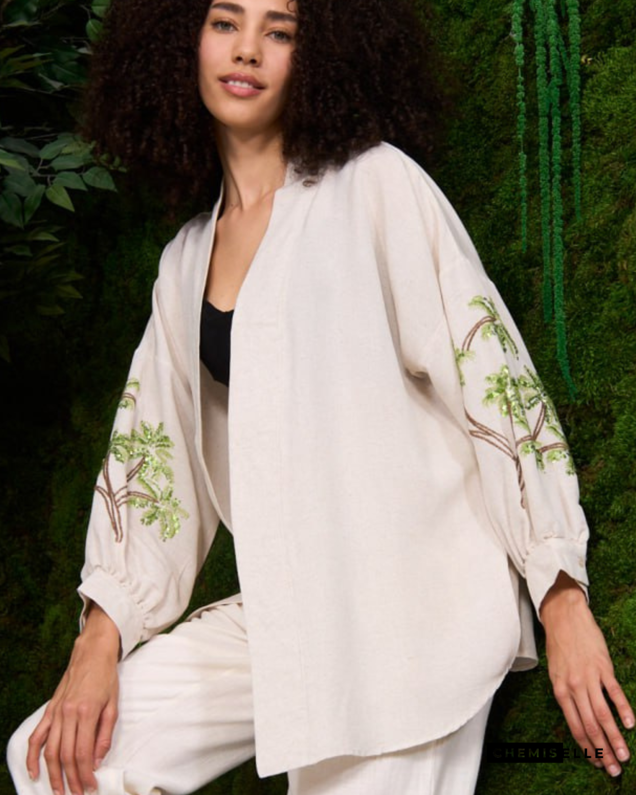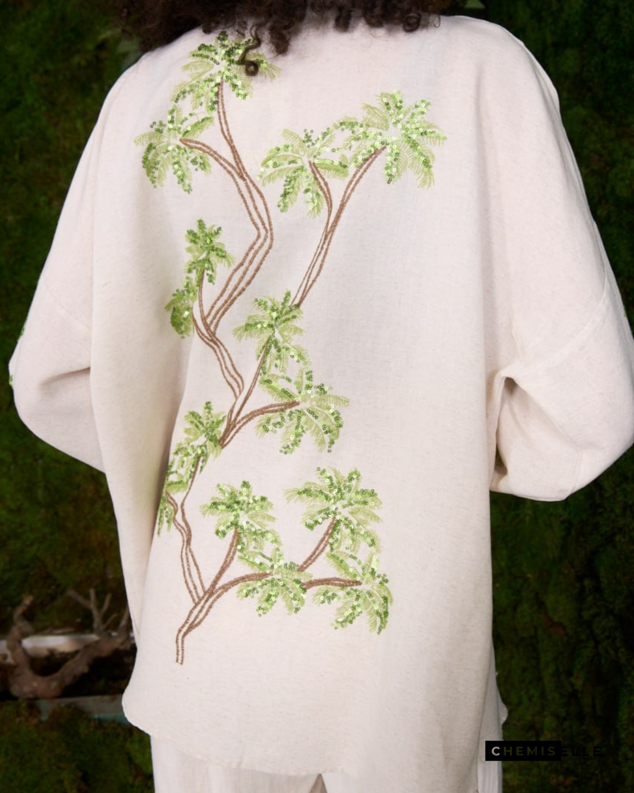 Design : Dos et manches brodés en fines formes de palmier, ornés de sequins pour une touche de brillance. Le devant est simple, apportant une belle harmonie au design.