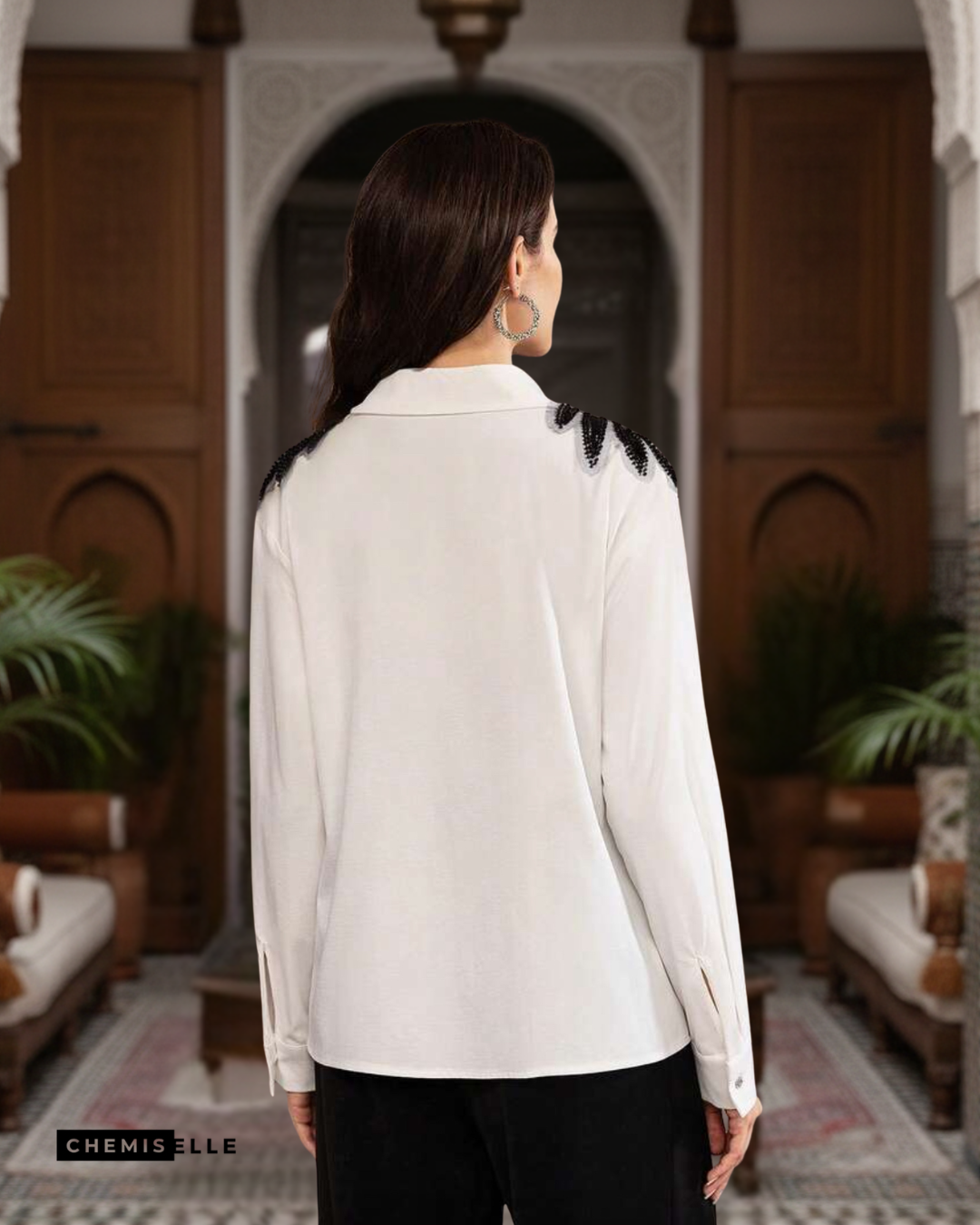 La chemise Blanc Impérial incarne l’élégance contemporaine avec une touche couture. Confectionnée dans un blanc lumineux et raffiné, elle se distingue par ses épaules délicatement ornées de perles noires formant un motif graphique sophistiqué.