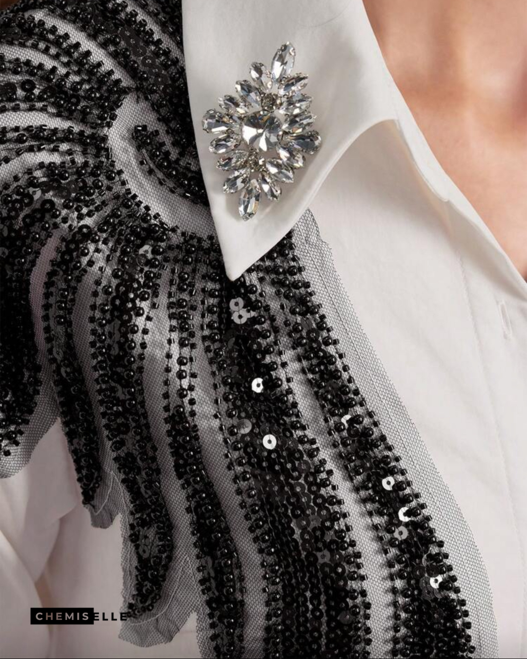 - Perles noires brodées sur les épaules