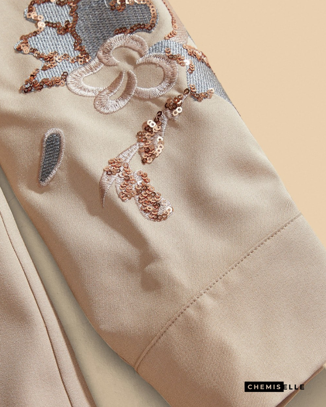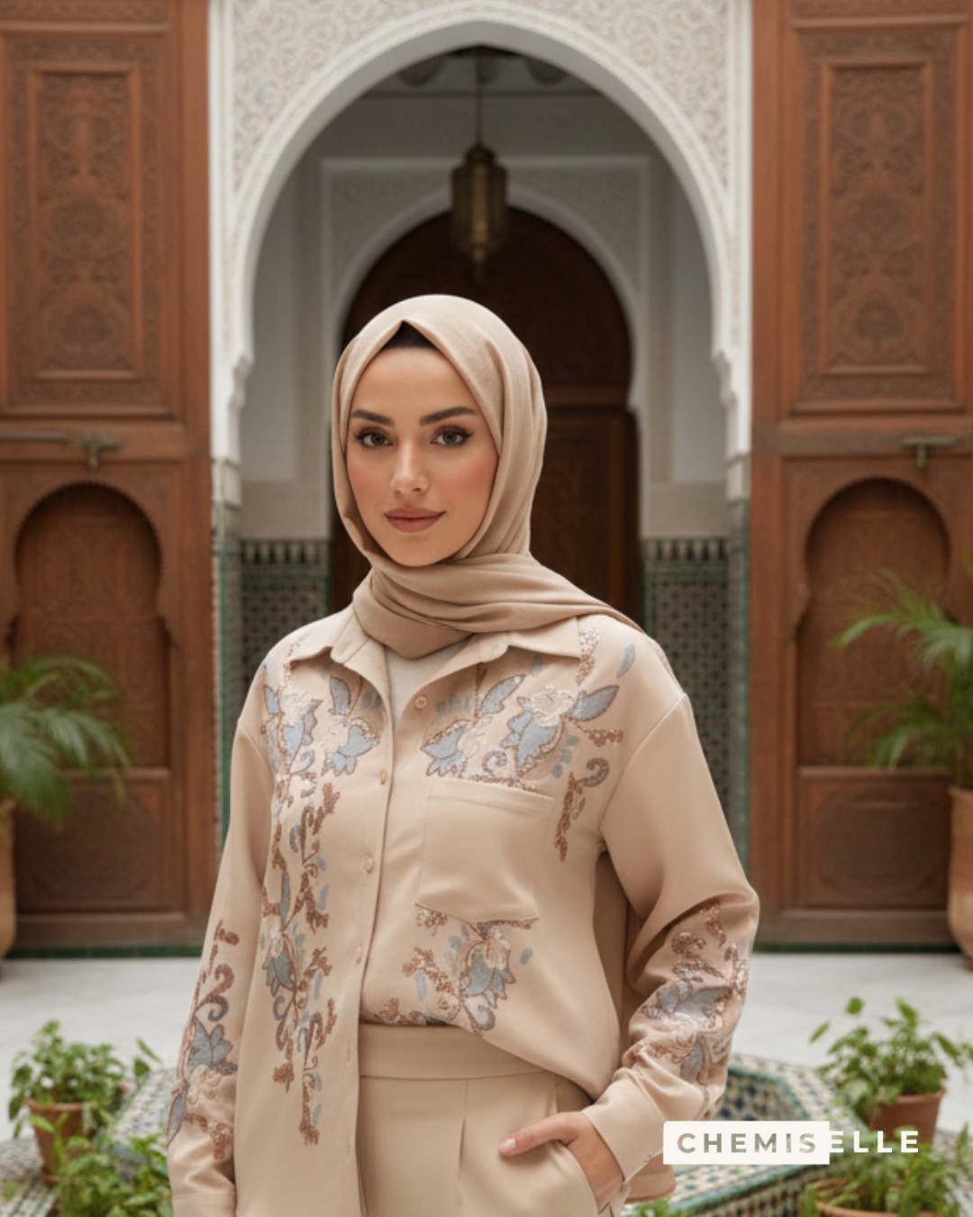 Une chemise nude délicatement brodée, sublimée par des sequins bronze lumineux. Une pièce raffinée, pensée pour illuminer vos tenues de Ramadan et célébrer l’Aïd El Fitr avec élégance.