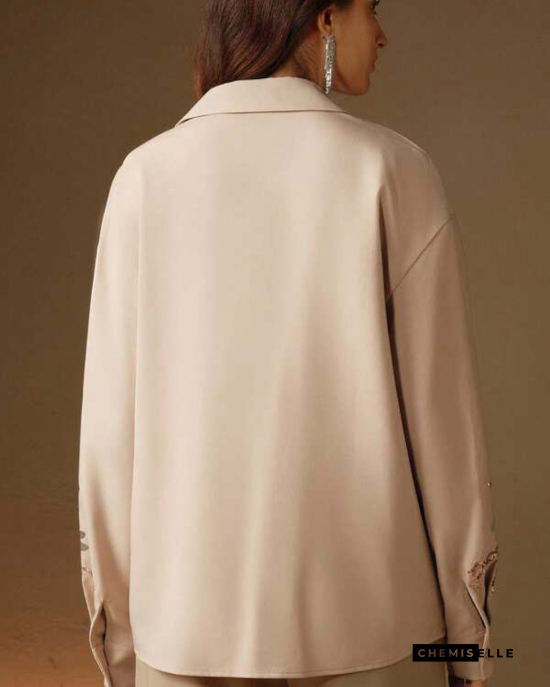 Douce, lumineuse et profondément élégante, cette chemise nude incarne la féminité subtile et le raffinement moderne.