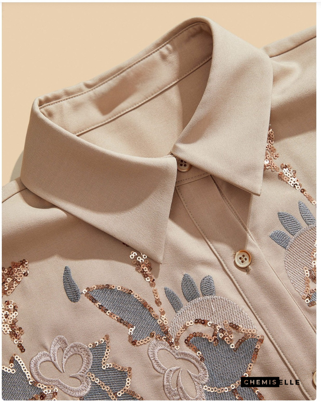 La chemise Bronze Lumière se distingue par sa douceur nude et ses broderies lumineuses. Pour un look harmonieux et raffiné, associez-la à des tons neutres comme le beige, l’écru, le taupe ou le blanc cassé afin de laisser les sequins bronze capter subtilement la lumière.