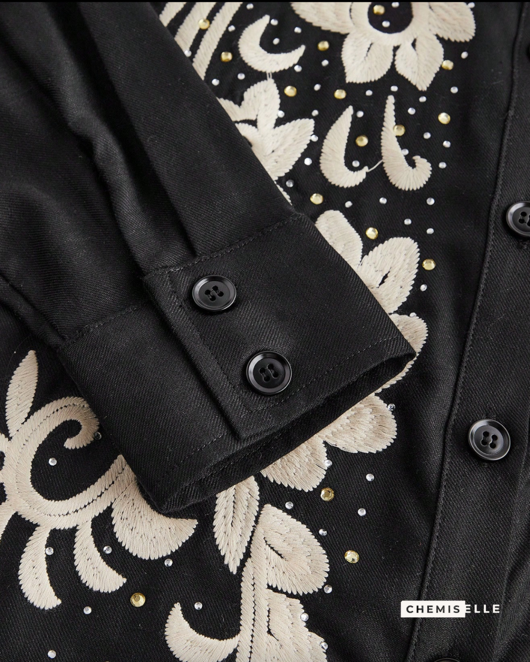 Proposée dans un noir profond et intemporel, la Chemise Noire Contrastée se distingue par ses motifs contrastés beige qui apportent du relief et du caractère, tout en restant faciles à associer avec d’autres pièces du dressing.