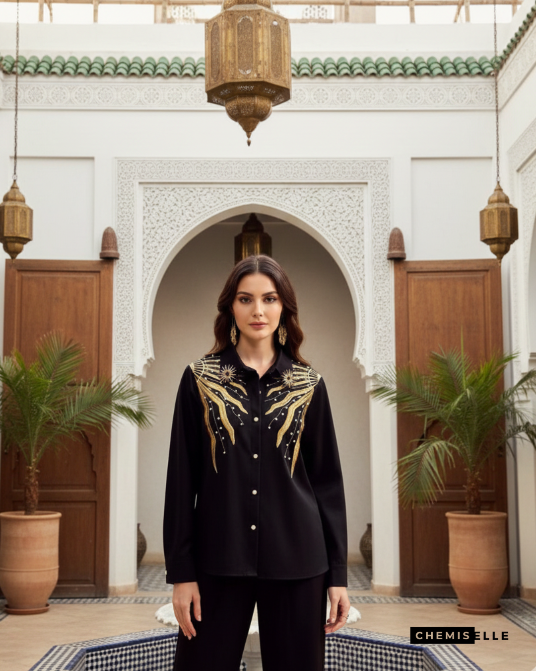 La chemise Noire Solaria adopte un style chic et élégant, idéal pour les soirées, les événements spéciaux ou les occasions où une allure raffinée est de mise. Ses détails dorés et perlés apportent une touche précieuse qui élève instantanément la tenue.