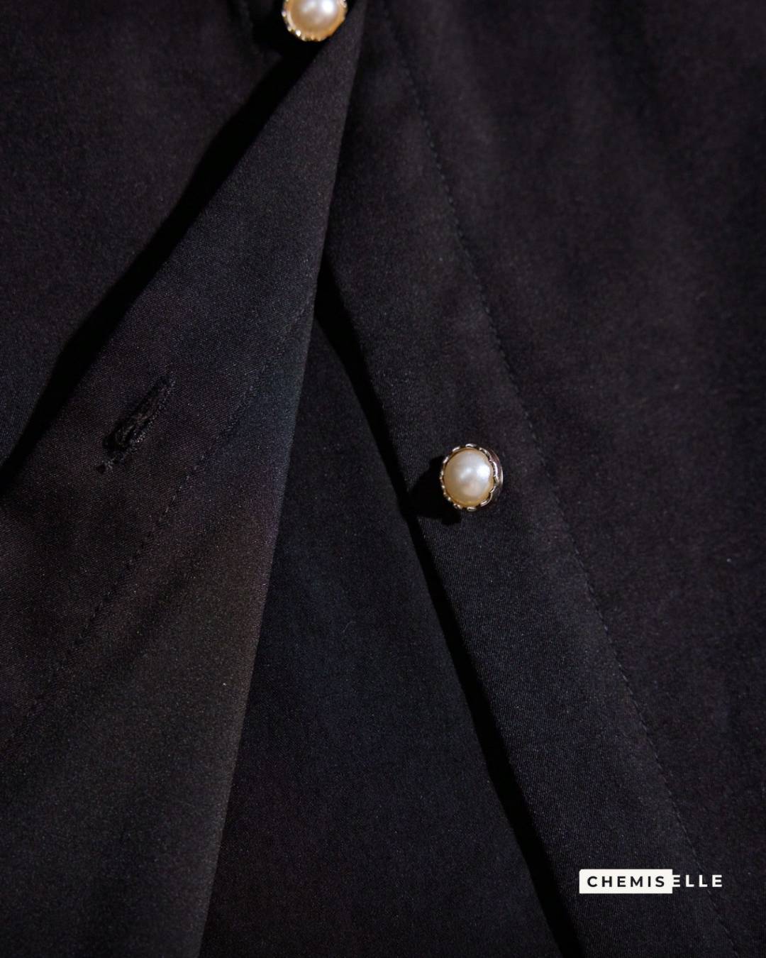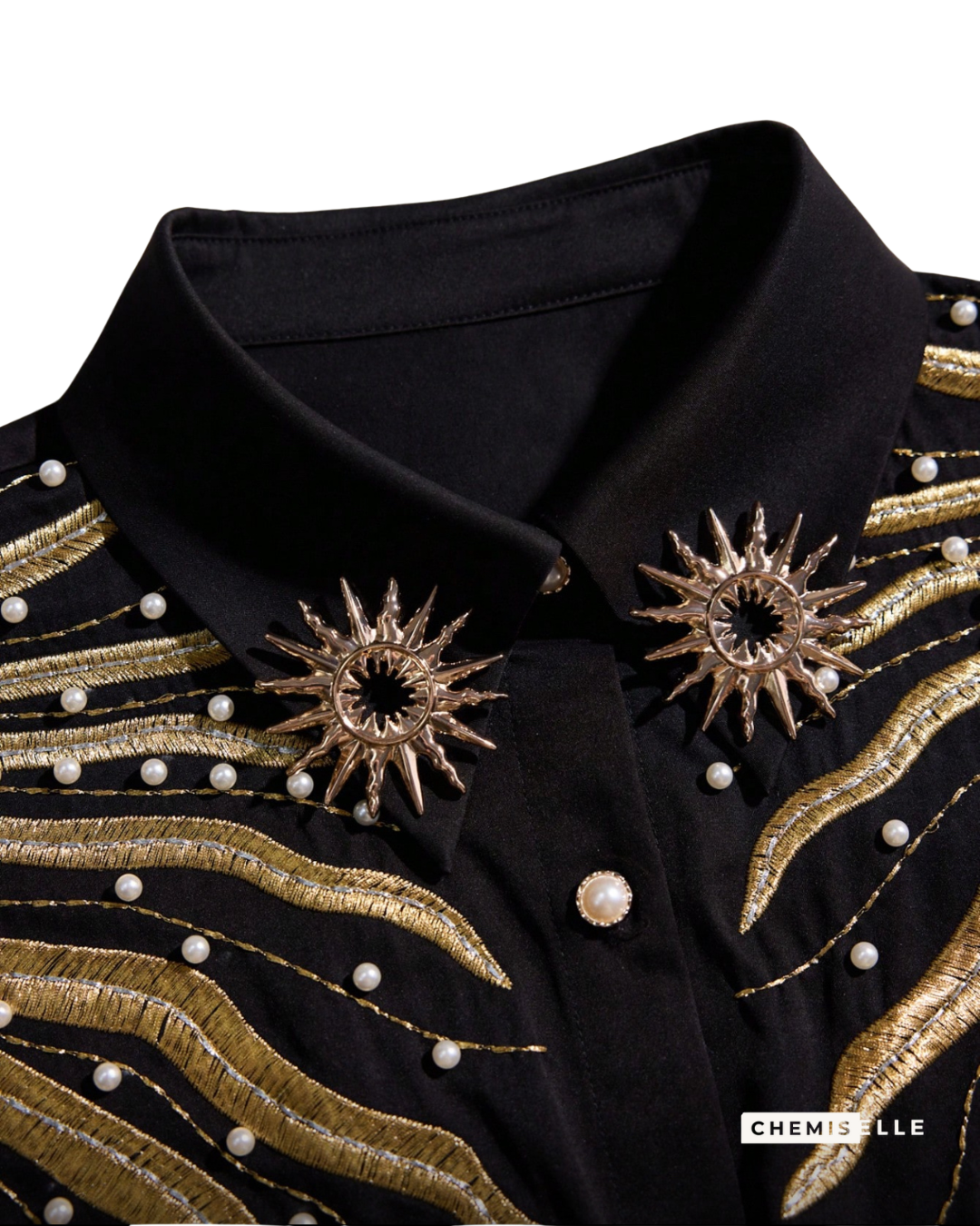 Chemise noire sans poche, non doublée, à manches longues et coupe droite. Broderie dorée en forme de rayons de soleil au niveau des épaules vers la poitrine, ornée de perles blanc cassé. Col décoré de deux broches dorées amovibles en forme de soleil. Boutons en perles entourées de doré pour une finition bijou.