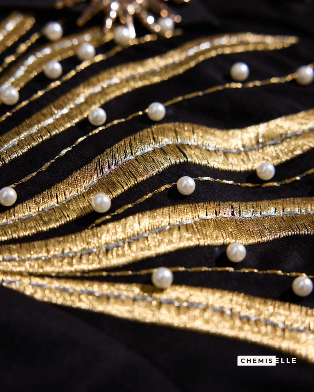 Noir profond avec détails dorés et perles blanc cassé