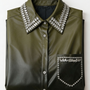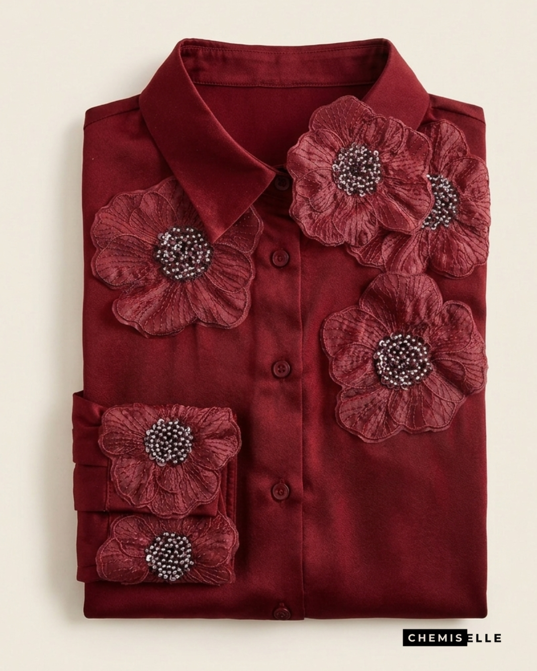 Son design repose sur un équilibre subtil entre simplicité et sophistication. La base satinée rouge foncé est rehaussée de fleurs appliquées en relief, chacune ornée de strass scintillants au centre, apportant une finition précieuse sans excès. Les manches bishop renforcent l’allure couture et féminine de la chemise.