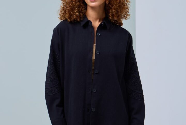Design : La coupe est légèrement oversize pour un effet décontracté et confortable. Le col classique et les poignets boutonnés apportent une touche d’élégance tandis que les boutons argentés ajoutent un contraste chic.